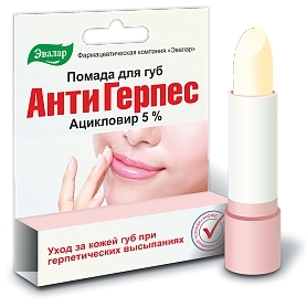 Помада для губ АнтиГерпес Эвалар сдержит 5% ацикловира и экстракты лекарственных трав. Способствует быстрому устранению герпетических высыпаний.