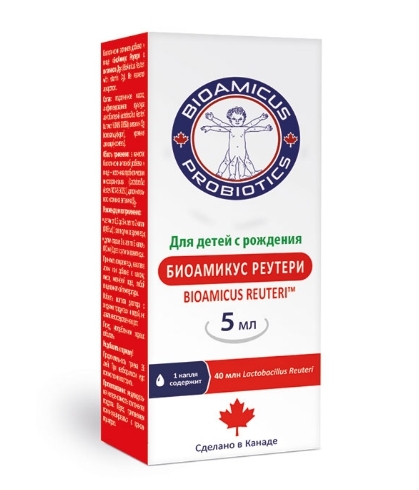 BioAmicus Reuteri это натуральные человеческие лактобактерии (выделенные из грудного молока) для одновременной профилактики и терапии колик, запоров, изжоги, газообразования и поднятия иммунитета. Область применения - в качестве биологически активной добавки к пище для детей с рождения – источника пробиотических микроорганизмов (лактобактерий).