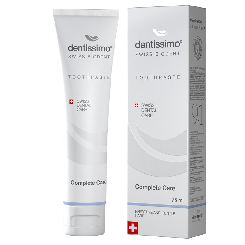 Зубная паста Dentissimo Complete Care 9 в 1 отбеливает, удаляет зубной налет, препятствует отложению зубного камня, препятствует образованию кариеса, укрепляет эмаль, снижает чувствительность зубов, питает ткани десен, предотвращает воспаление, освежает дыхание.