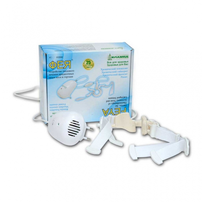Аппарат теплового лечения придаточных пазух носа и гортани Еламед ФЕЯ (УТЛ-01 ЕЛАТ) предназначен для прогревания гайморовых пазух, лобных пазух и гортани в стационарных, амбулаторных и домашних условиях по рекомендации врача. Обеспечивая глубокий прогрев гайморовых пазух, аппарат Еламед ФЕЯ убивает микробы и вирусы, не давая им распространяться на весь организм. За счет прямой теплопередачи усиливается обмен веществ в области носоглотки; рефлекторно расширяются кровеносные сосуды, что способствует восстановлению кровообращения и ускорению заживления слизистой оболочки носоглотки, в том числе и при острых респираторных вирусных инфекциях (ОРВИ). Кроме этого, прогрев замедляет размножение вирусов острых респираторных вирусных инфекций и приводит к их гибели. Локальный прогрев полости носа аппаратом Еламед ФЕЯ — профилактический и во время болезни — является эффективным средством лечения ОРВИ. ФЕЯ позволяет снизить прием лекарственных средств и сократить сроки лечения.