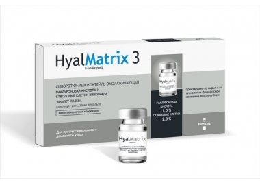 Гиалматрикс 3 - омолаживающая сыворотка-мезококтейл, актвиные компоненты которой - гиалуроновая кислота и стволовые клетки виногрда, обеспечивающие видимое омоложение кожи, уменьшие глубины морщин и длительный увлажняющий эффект.