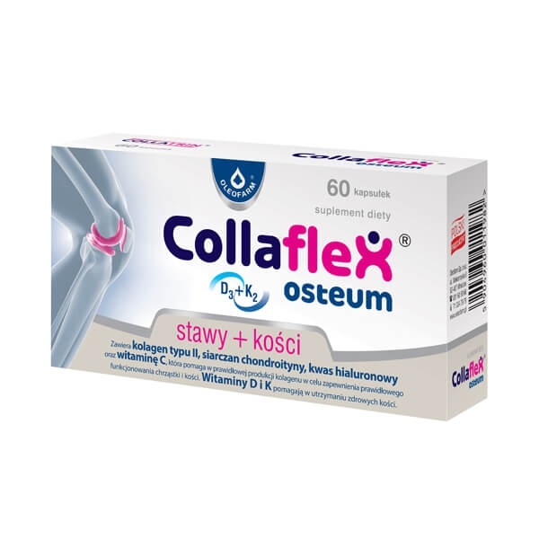 Collaflex Osteum - препарат, рекомендованный для людей, которые поддерживают здоровый хрящ и здоровые кости, особенно для пожилых людей и людей, активно занимающихся спортом. Содержит Collatrin®, который обеспечивает компоненты, обнаруженные в хряще: коллаген типа II, хондроитинсульфат и гиалуроновая кислота. Кроме того, он содержит витамины C, D 3 и K 2 . Витамин С помогает в правильном производстве коллагена для обеспечения надлежащего функционирования хряща и кости, а также помогает защитить клетки от окислительного стресса. Витамин К и витамин D помогают поддерживать здоровые кости.