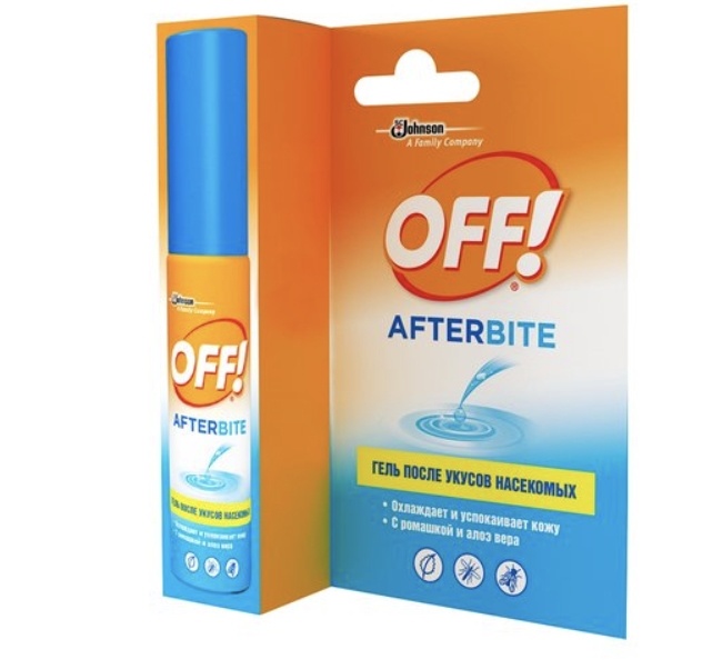 Гель после укусов насекомых Off! After-bite имеет в своем составе экстракты ромашки и алоэ, благодаря целебным свойствам которых, гель после укусов насекомых быстро и эффективно охлаждает и успокаивает кожу, снимает боль и раздражение.
