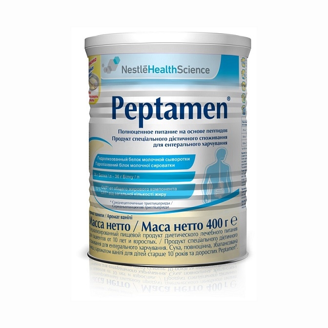 Смесь Пептамен - специализированный продукт диетического лечебного питания на основе гидролизованного белка молочной сыворотки, обогащенный СЦТ, для пациентов от 10 лет и взрослых. Облегчает усвоение и всасывание всех необходимых питательных веществ у пациентов с резко пониженной способностью всасывания, применяется для ускоренного восстановления после перенесенных заболеваний ЖКТ. Может использоваться в качестве единственного источника питания.