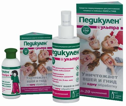 Педикулен ультра – дезинсекционное средство, уничтожает вшей и гнид за одно применение. Выпускается в форме спрея, лосьона, шампуня и гребня. Действующее вещество - анисовое масло.