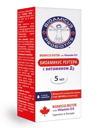 БиоАмикус Реутери c витамином Д3 (BioAmicus Reuteri with Vitamin D3) это натуральные человеческие лактобактерии (выделенные из грудного молока) в сочетании с витамином Д3 для одновременной профилактики и терапии колик, запоров, изжоги, газообразования, а также рахита и дефицита витамина Д3 и поднятия иммунитета