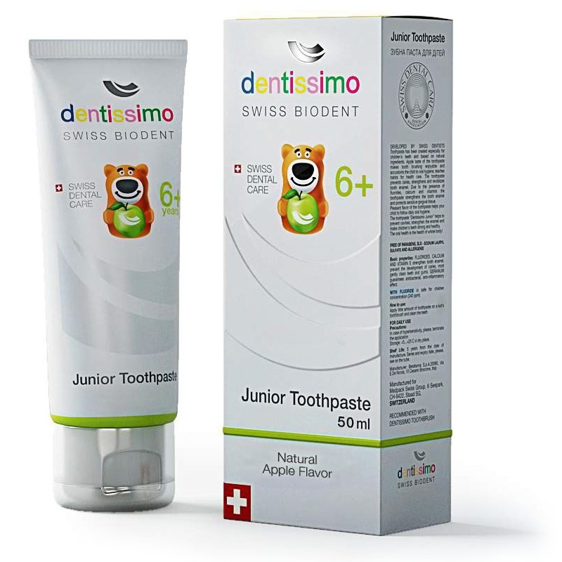 Зубная паста Dentissimo Junior With Apple Aroma подходит для ежедневного использования, укрепляет зубную эмаль, бережно очищает зубы и десны, предотвращает кариес. Обладает противовоспалительным и антибактериальным действием. Не содержит парабенов, лаурил сульфата натрия. Содержание фторида 240 ррм.