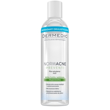 Dermedic NORMACNE Мицеллярная жидкость H2O мягко и эффективно удаляет остатки макияжа и загрязнений с поверхности кожи, оказывает смягчающее и противовоспалительное действие, ограничивает избыточную жирность кожи.