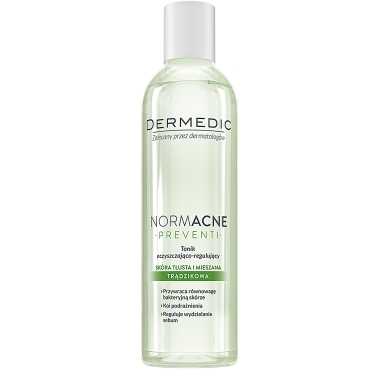 Очищающий регулирующий тоник Dermedic NORMACNE снимает местное воспаление кожи, уменьшает число активных сальных желез, ограничивает жирность кожи, не сушит кожу.