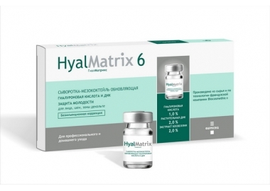 Гиалматрикс 6 - обновляющая сыворотка-мезококтейль, активные компоненты которой - гиалуроновая кислота и ДНК, обеспечивают для кожи: биоревитализацию, омолаживающий эффект, восстановление защитных функций кожи и защиту от УФ.