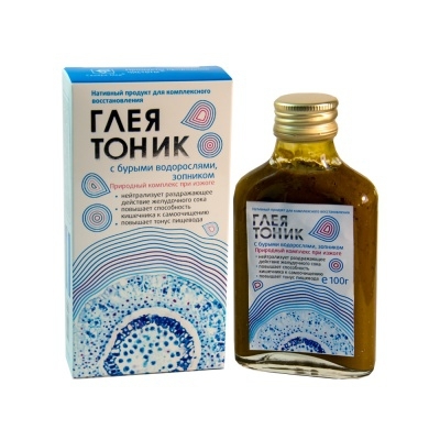 «Глеятоник» с бурыми водорослями, зопником – нативный природный продукт на основе биологического комплекса зооглеи и эковытяжек лекарственных растений, способствующий устранению нарушений пищевода, нейтрализации соляной кислоты желудочного сока, нормализации моторики органов пищеварительной системы.
