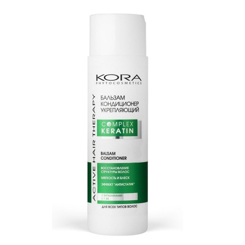 Бальзам-кондиционер Кора укрепляющий для всех типов волос смягчает, наполняет волосы силой снаружи и изнутри, питая и восстанавливая их по всей длине. Система кондиционирующих добавок бальзама защищает кутикулу волоса от повреждений, вызванных тепловым воздействием при сушке и укладке, облегчает расчесывание волос. Средство помогает избежать электризации, придает волосам щелковистость и блеск. После применения косметического средства значительно повышаются влагоудерживающие свойства волос и их сопротивляемость к повреждающим факторам, в том числе к УФ-излучению.
