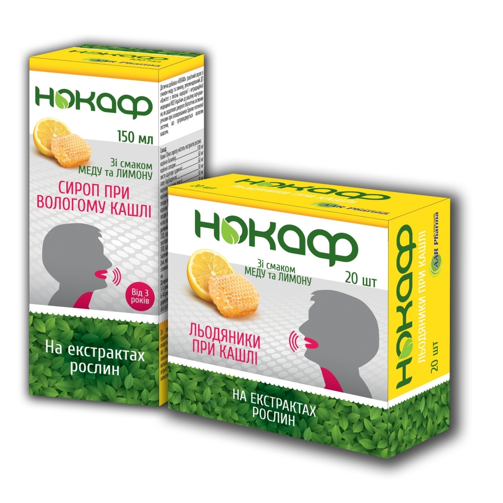 Нокаф - трав'яні льодяники та сиропи від кашлю, 3 смаки сиропу та 4 смаки льодяників. Препарат має відхаркувальну, антибактеріальну, протигрибкову та противірусну, протизапальну дію.