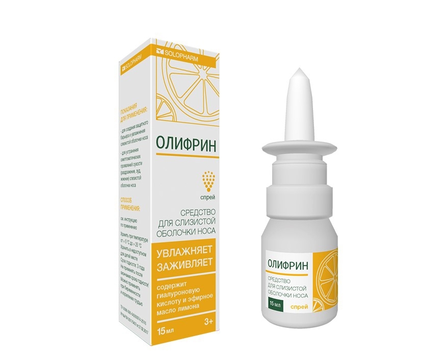 Олифрин - спрей назальный для увлажнения и заживления слизистой оболочки носа. Содержит гиалуроновую кислоту и эфирное масло лимона. Подходит для детей с 3-х лет и взрослых.