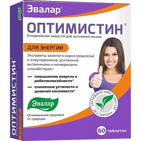 Каждая таблетка Оптимистина – это тщательно подобранный комплекс необходимых витаминов и микроэлементов, польза которых усилена действием элеутерококка и родиолы розовой. Это именно то, что способно активировать естественную внутриклеточную энергию организма и помочь ему справиться с невероятными нагрузками современной жизни. Оптимистин стимулирует энергетический обмен и питание тканей, уравновешивает нервную систему и в то же время повышает жизненный тонус организма.