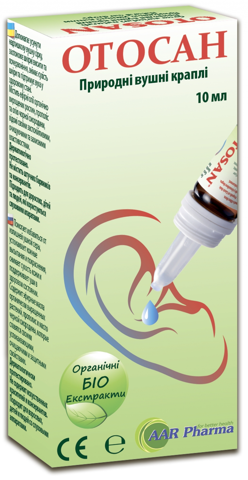 Отосан - природные ушные капли (Отосан natural ear drops) - препарат для поддержания здорового состояния ушей, который помогает удалить лишнюю ушную серу и предотвращает ее образование. Благодаря наличию органических растительных масел, в том числе масла черной смородины и прополиса, он предотвращает возникновение высыпаний на коже и покраснение, глубоко очищает и защищает слуховой проход, снимает сухость кожи.