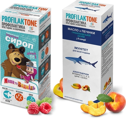 Профилактон - сироп содержащий рыбий жир из печени Гренландской акулы, иммуностимулирующий, витамины А, D, E, C, цинк и селен со вкусом малины для детей.