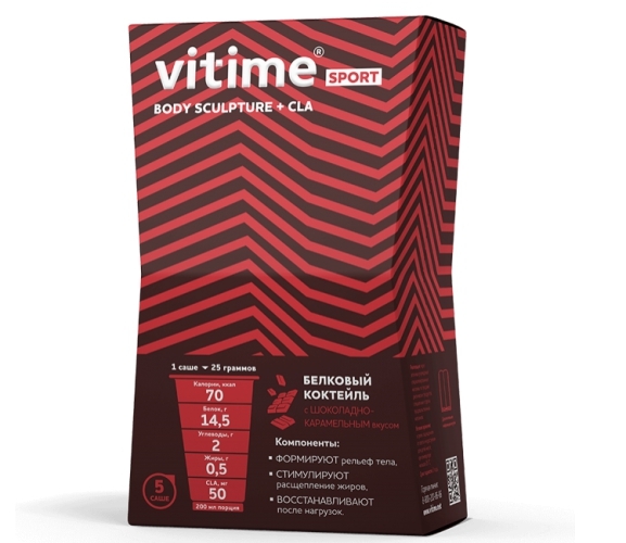 Vitime Body Sculpture + CLA - белковый коктейль с шоколадно-карамельным вкусом. Формирует рельеф тела, стимулирует расщепление жиров и способствует восстановлению после физических нагрузок.