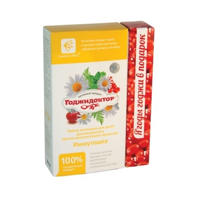 Годжидоктор Иммутошка – общеукрепляющий чай для детей от 1 года; препятствует вирусным, воспалительным процессам, аллергии, восстанавливает иммунитет, нормализует состояние пищеварительной системы и лор-органов.