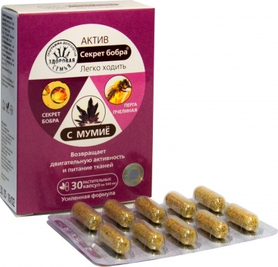 «Секрет бобра» АКТИВ с мумиё – нативная формула природного комплекса усиленного действия в растительных капсулах. Натуральный нативный комплекс из бобровой струи, мумиё, активизированный пергой пчелиной, обладает усиленным восстанавливающим действием на суставы, хрящевую ткань, опорно-двигательную систему.