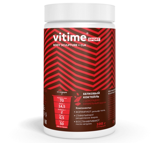 Vitime Body Sculpture + CLA - белковый коктейль с шоколадно-карамельным вкусом. Формирует рельеф тела, стимулирует расщепление жиров и способствует восстановлению после физических нагрузок.